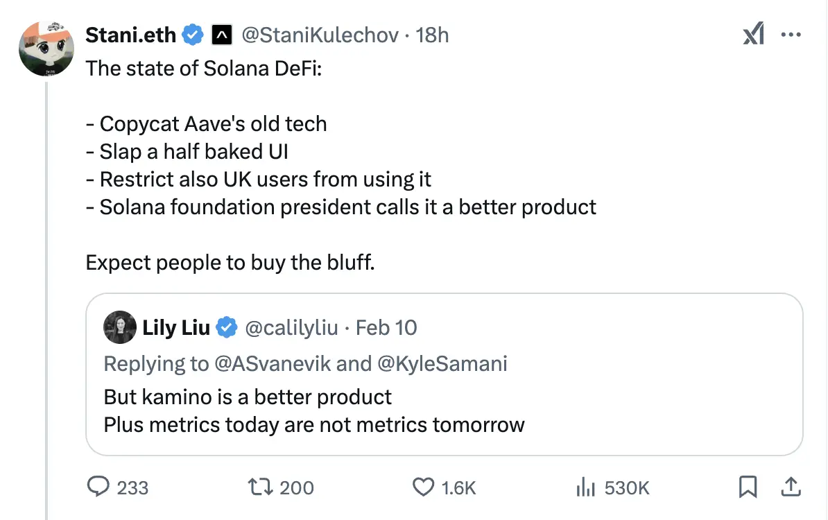Aave 创始人 Stani 直接开火,说 Solana DeFi 的现状是抄袭 Aave 的旧技术,粘贴一个半成品的 UI,还限制英国用户使用。尽管 Stani 说的是 Solana DeFi,但明眼人知道他针对的是同为借贷协议的 Kamino。