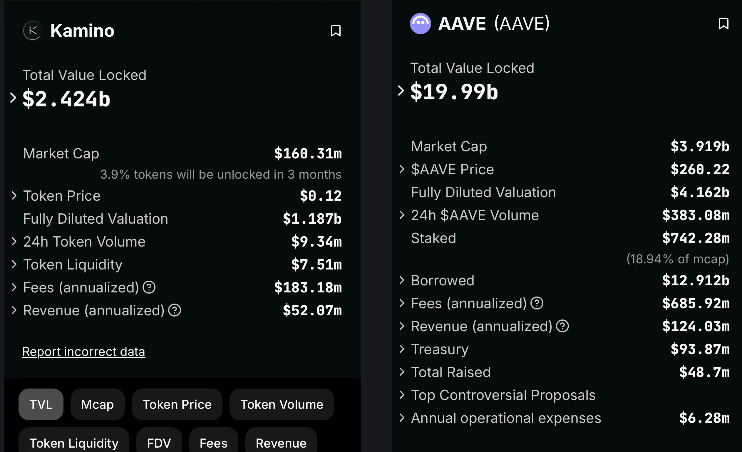 于是,toly 将 Aave 和 Kamino 的 DeFiLlama 界面发了出来,表示 Kamino 的 TVL 是 Aave 的 1/8,但收入只有其 1/2.5。「我不明白为什么 Aave 会是更好的产品,如果从中挤不出收入,TVL 只是一个成本。」