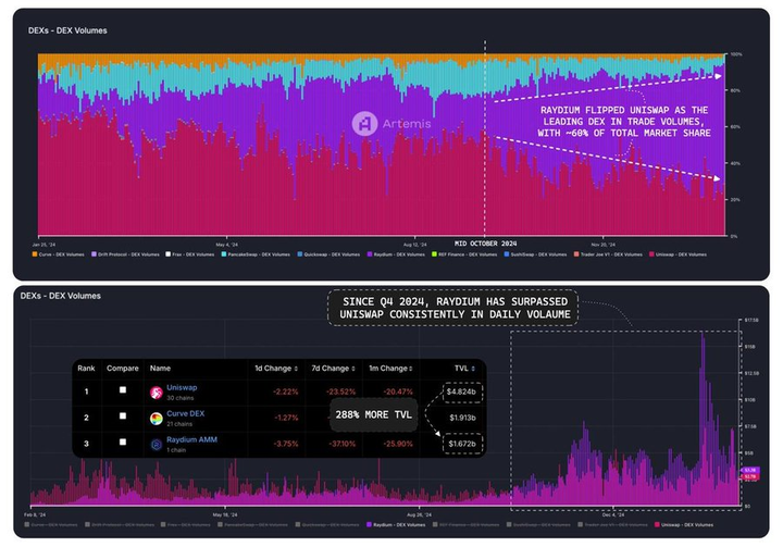 首先来看去中心化交易平台(DEXs):在 2024 年第四季度,@RaydiumProtocol 凭借约 61% 的市场份额超越了@Uniswap,成为该领域的领导者。