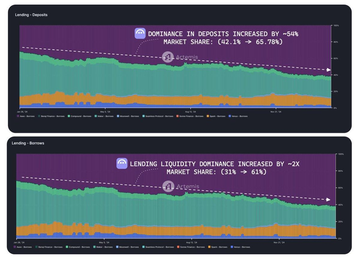 借代领域也是如此。自 2024 年以来,@aave 在借代和借款领域的行业主导地位愈发明显: