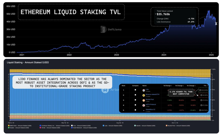 @LidoFinance 是无可争议的主导者,掌控了约 70% 的市场份额,几乎垄断了 LST 市场。其 TVL(248 亿美元)是第二大竞争者@binance 的 $bETH(48 亿美元)的 5.17 倍。