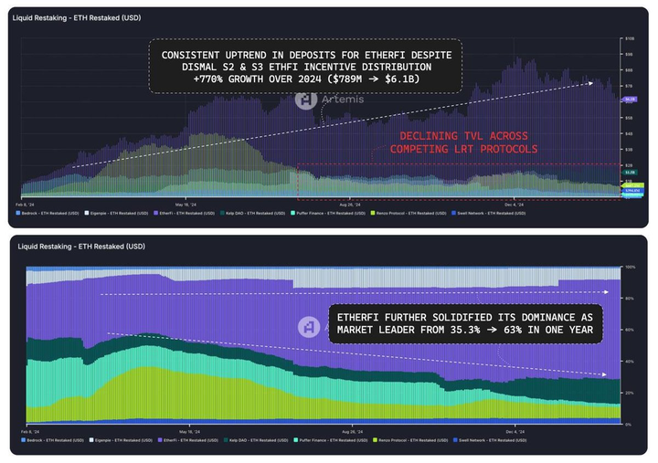 值得注意的是,@ether_fi 的市场主导地位显著提升(从 35.3% 增至 63%),其 TVL 在 2024 年增长了约 770%,即使在 S1 和 S2 stakedrop 结束后仍然保持增长。