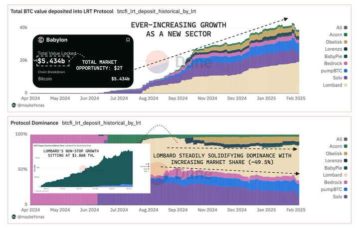 @Lombard_Finance 在 BTC-Fi 领域的表现与 LST/LRT 领域的趋势高度相似,稳步上升至 49.5%。