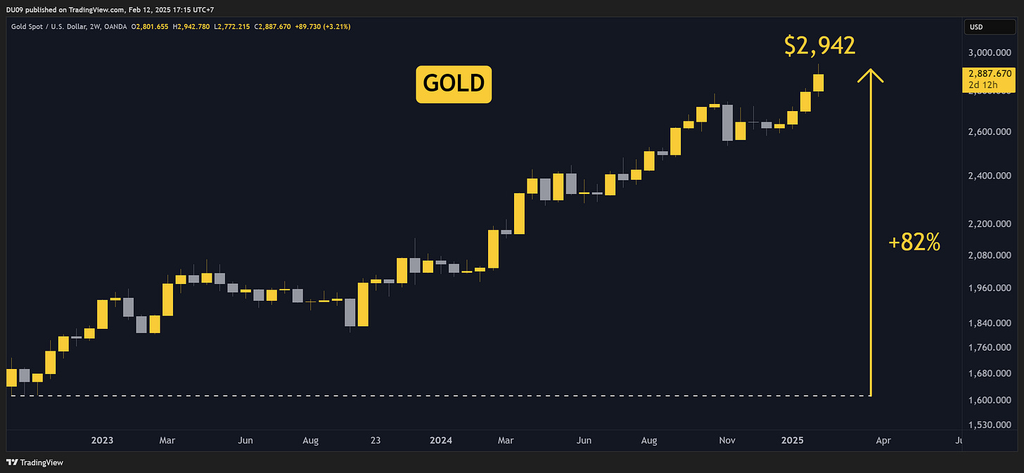 在深入讨论加密货币之前,我们先聊聊黄金。如果你还没注意到,本周黄金(XAU)创下了历史新高,价格接近每盎司 3,000 美元。相比两年前,黄金价格几乎翻了一倍。这背后究竟发生了什么?