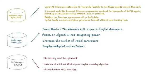 尽管 Web3 的 AI 协议和 Web2 的完全不同,但也不可避免地承受 DeepSeek 的影响,这种影响会对 Web3 AI 上下游:基础设施层、中间件层、模型层和应用层,催生出全新的用例。