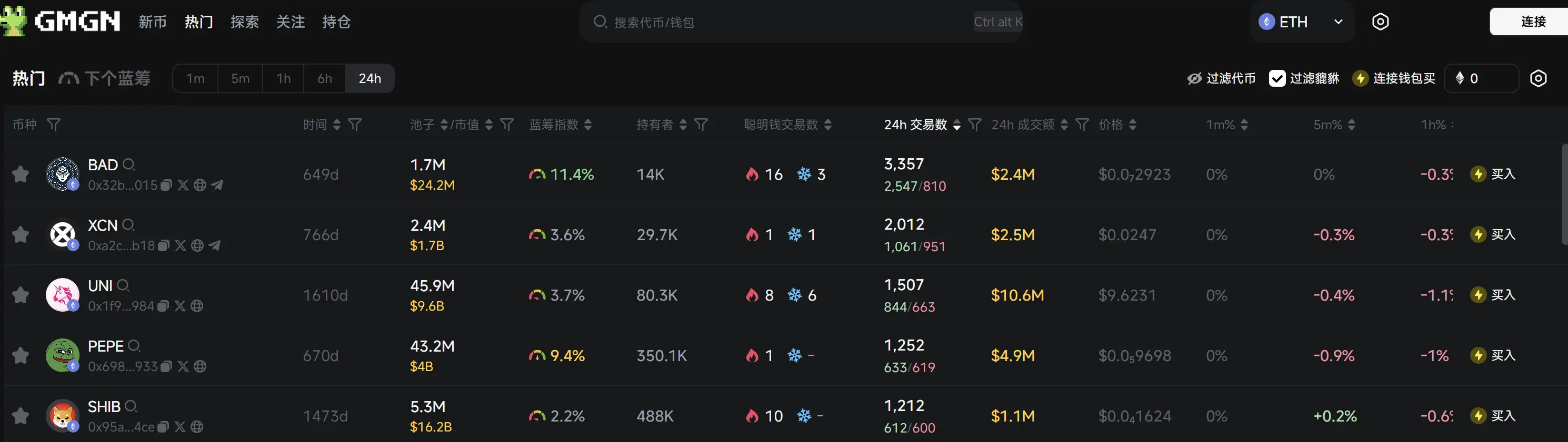 过去 24h 以太坊热门代币前五依次为:BAD、XCN、UNI、PEPE、SHIB
