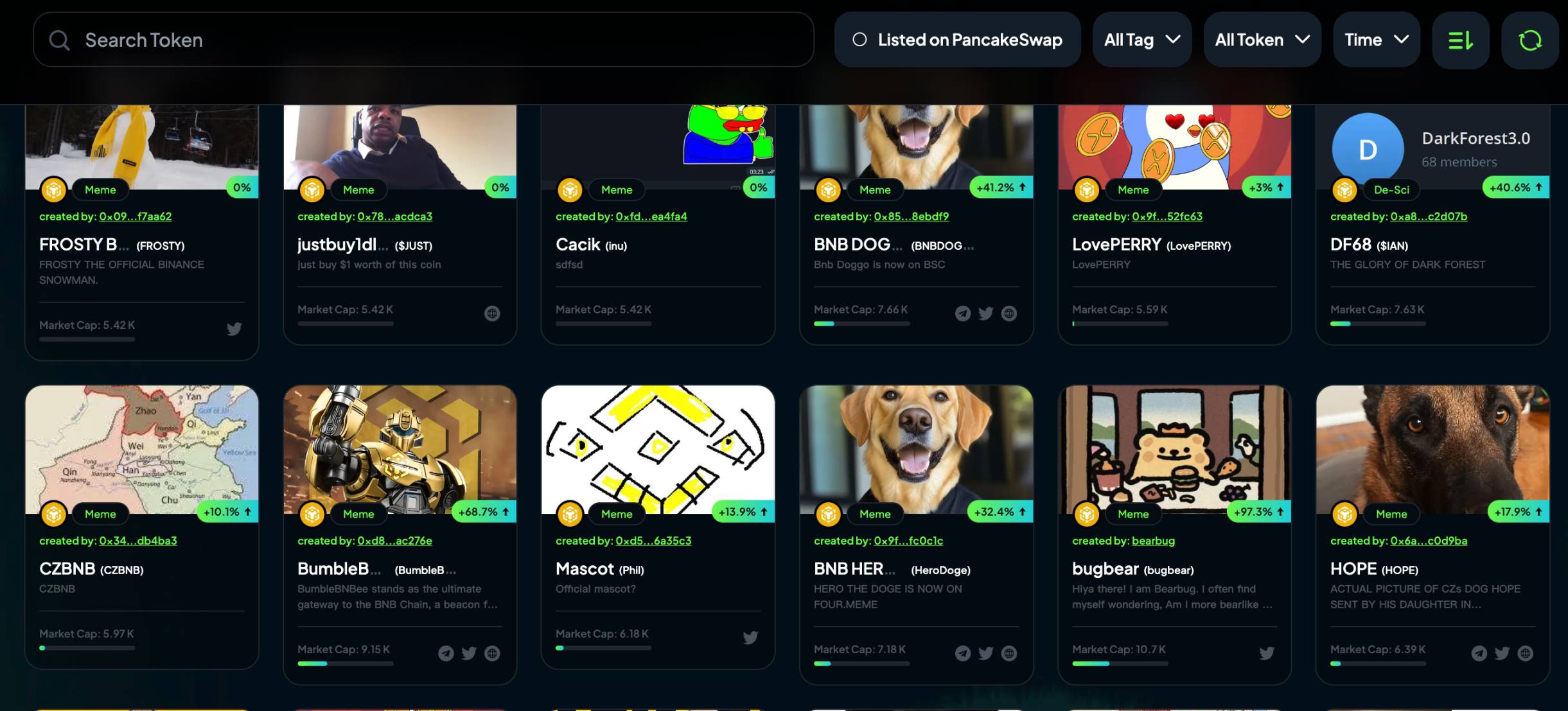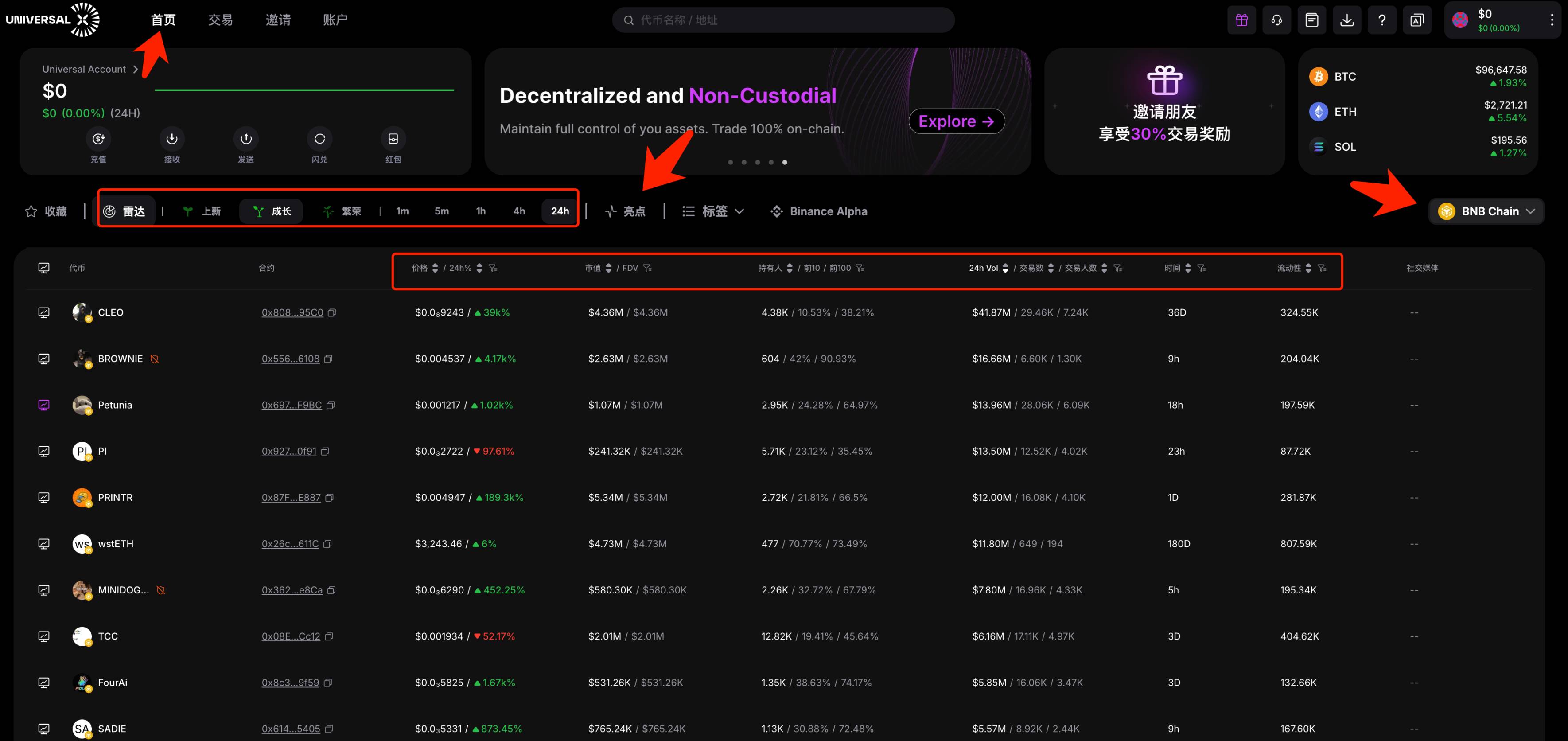 在 UniversalX的首页,选中【BNB Chain】在【雷达】部分按「上新」、「成长」、「繁荣」可以选择不同时期的币。主要过滤指标是市值、持有人、交易额、流动性。