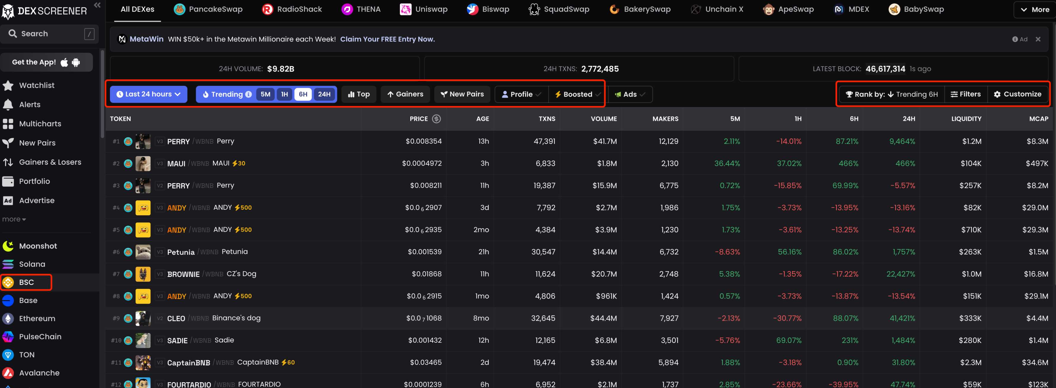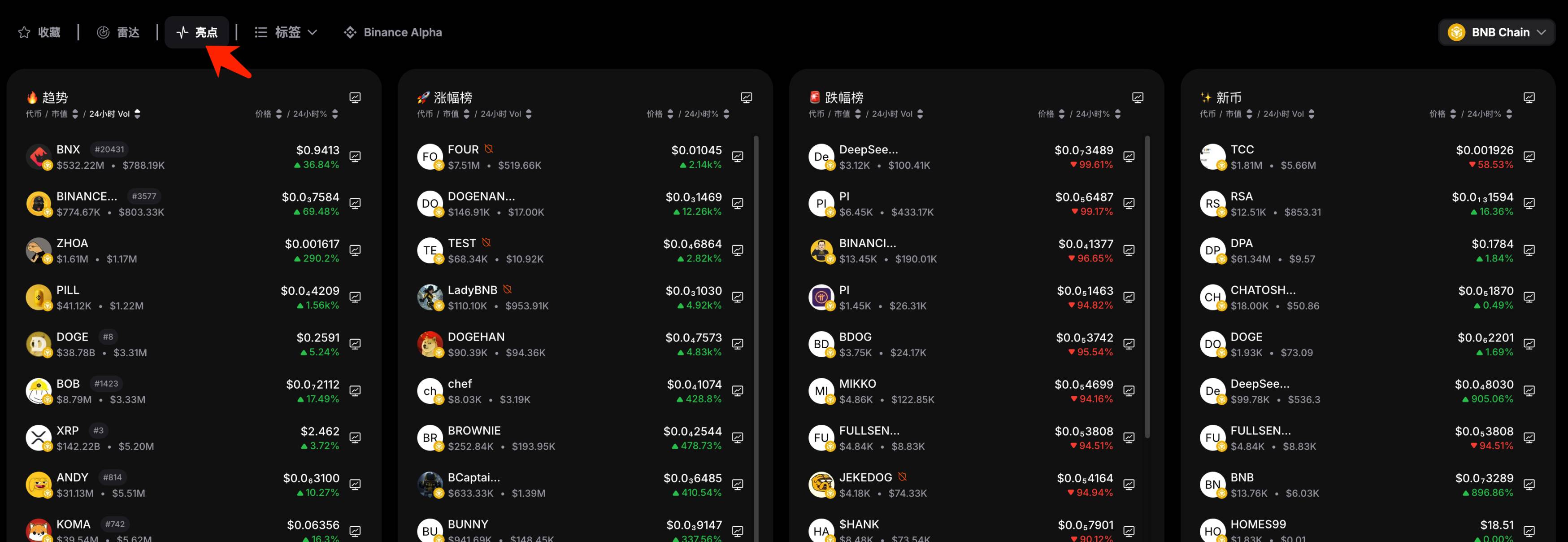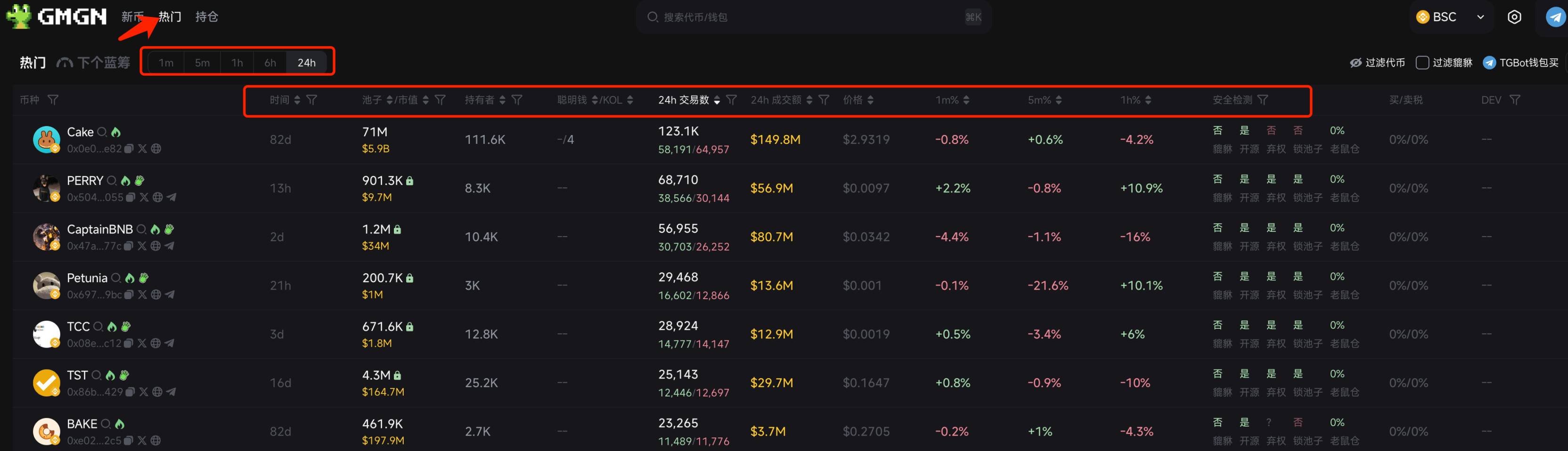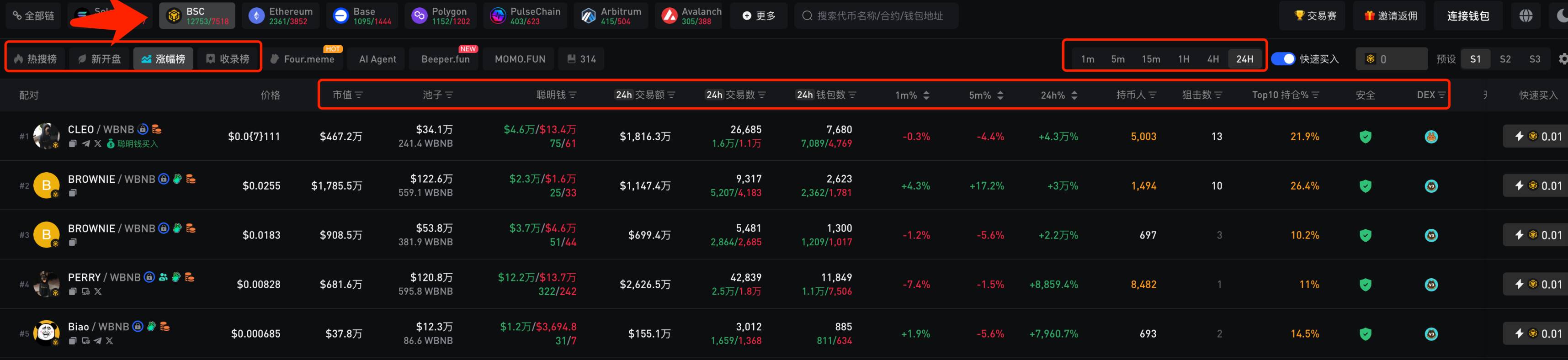 gmgn前段时间刚支持 BSC 链,还被 cz 转发引用。gmgn 的 BSC 链主要是【新币】和【热门】两个版块,和 debot类似。