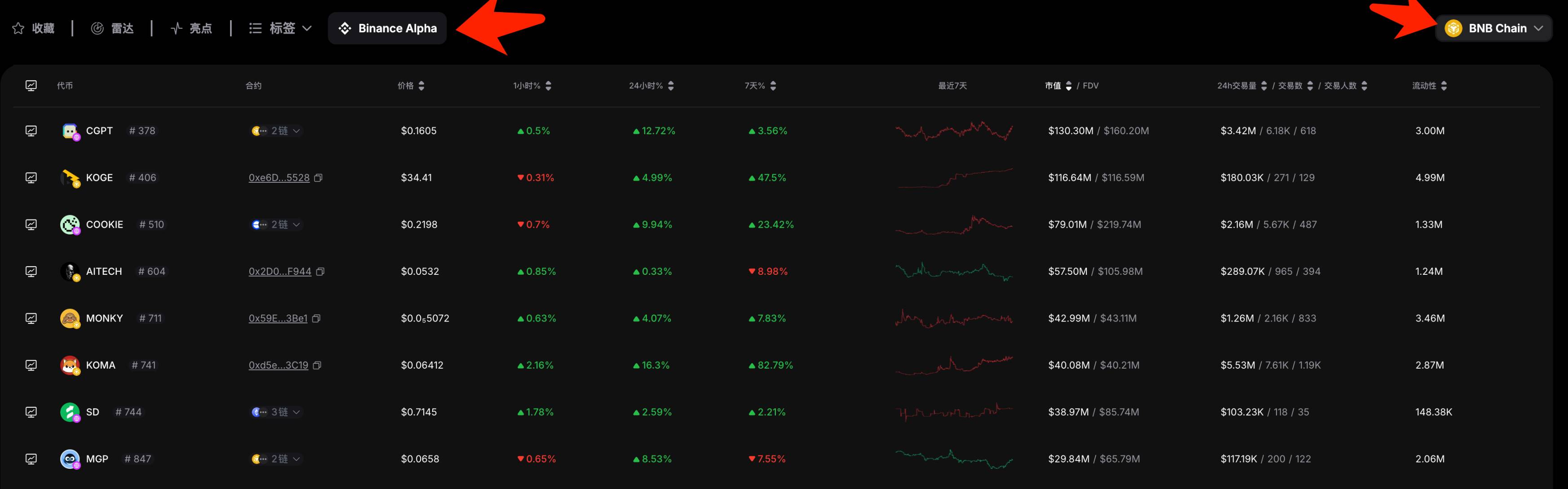 UniversalX还列出了 Binance Alpha 上的币,既可以按全链查看,也可以只查看某个链,比如 BSC 链的币。这个功能比币安钱包做的还好,币安钱包没法按链进行筛选。