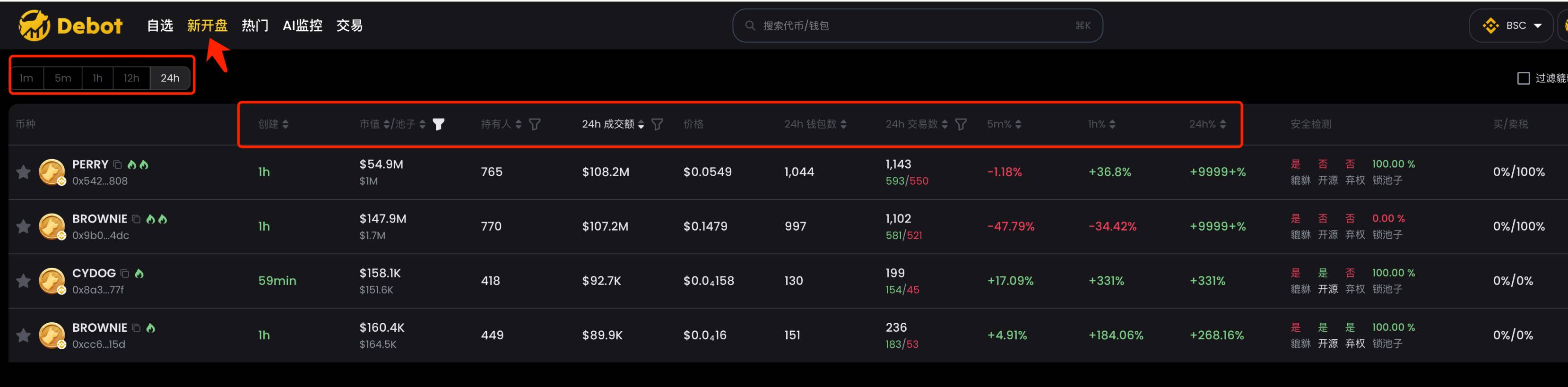 【新币】版块也是 24 小时内出来的新币,可以按时间筛选,粒度更细些;安全检测也支持筛选,EVM 上有些币刚开盘时不开源、不弃权、不锁池子都很常见,所以支持筛选确实很实用;其他的指标都是常见的,如图