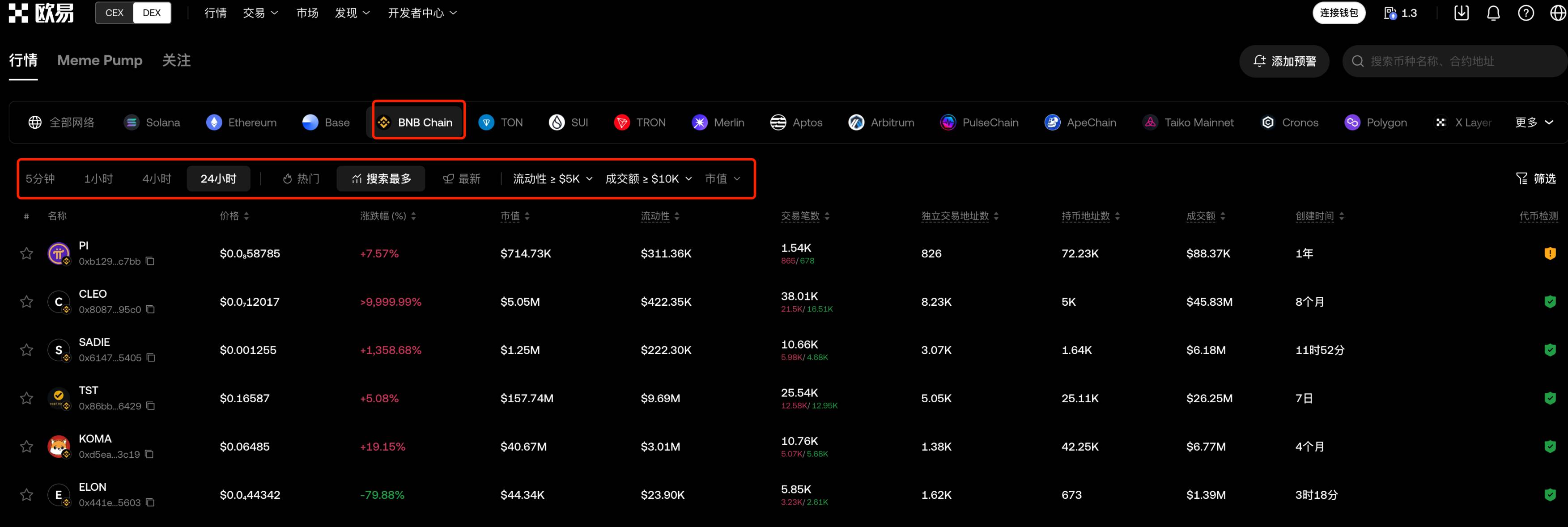 okx 做的比较全,各种链都支持,BSC 链也有。网页端相比 Web3 钱包功能丰富些,可以根据时间、热门、搜索最多、最新都指标进行筛选。