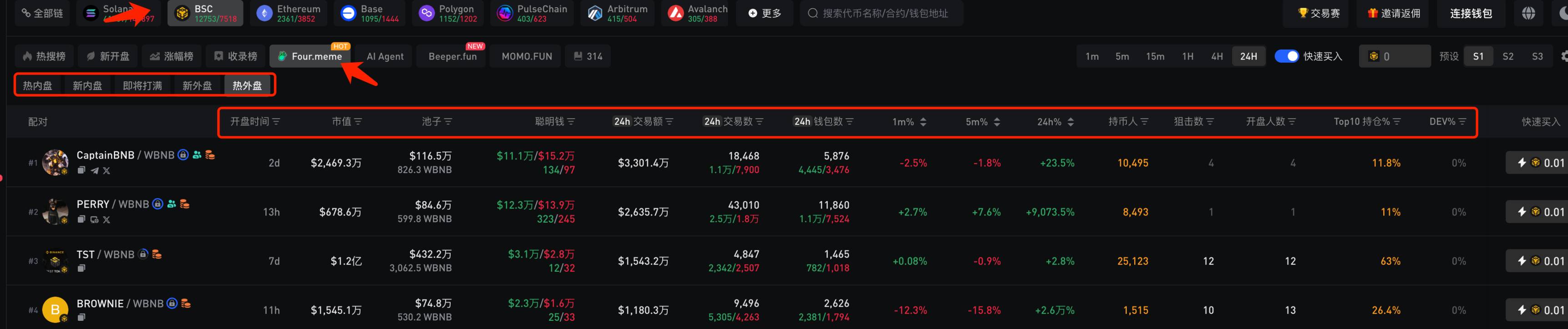 ave 上单独把 Four.meme 的币做了一个版块,支持【热内盘】、【新内盘】、【即将打满】、【新外盘】、【热外盘】五个版块。用来扫链还是不错的,感觉比官网的扫链舒服很多,希望其他家工具早些跟进。