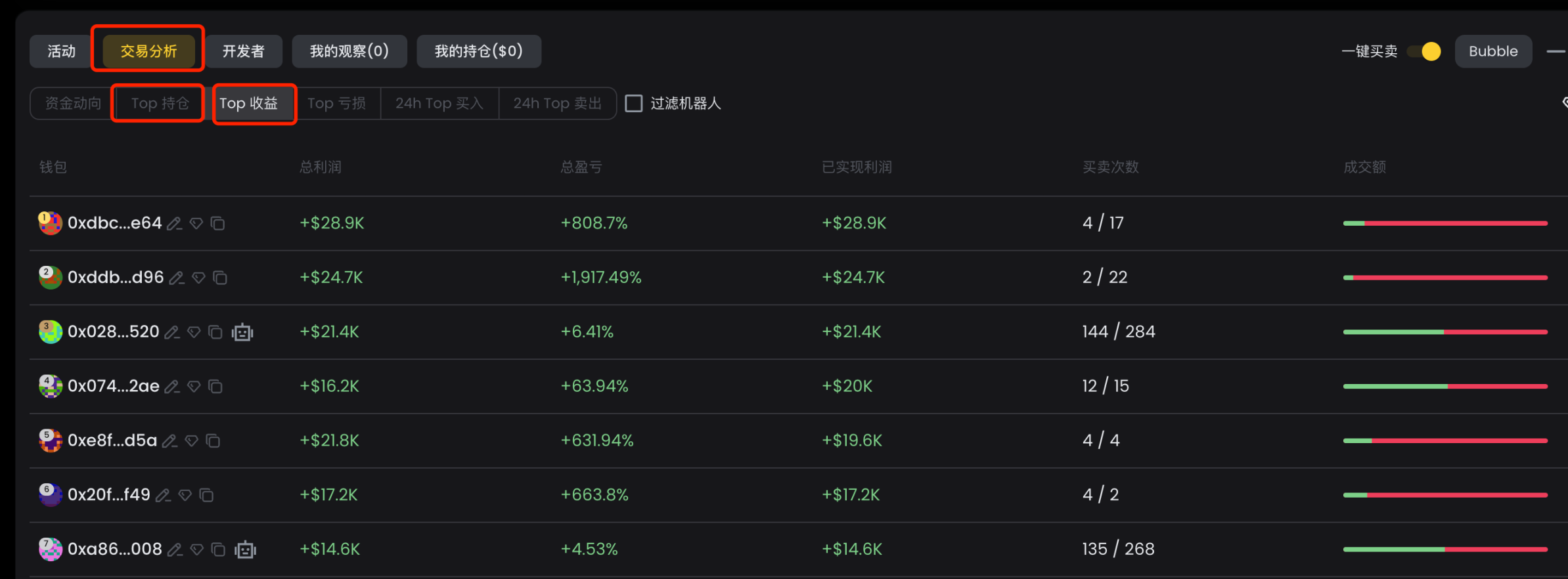 在 debot 中输入想分析币的 CA,打开最下面的【交易分析】,我们重点关注【Top 持仓】和【Top 收益】两部分。其中【Top 持仓】是 Top100 持仓的地址列表,【Top 收益】是 Top100 最赚钱地址的列表。