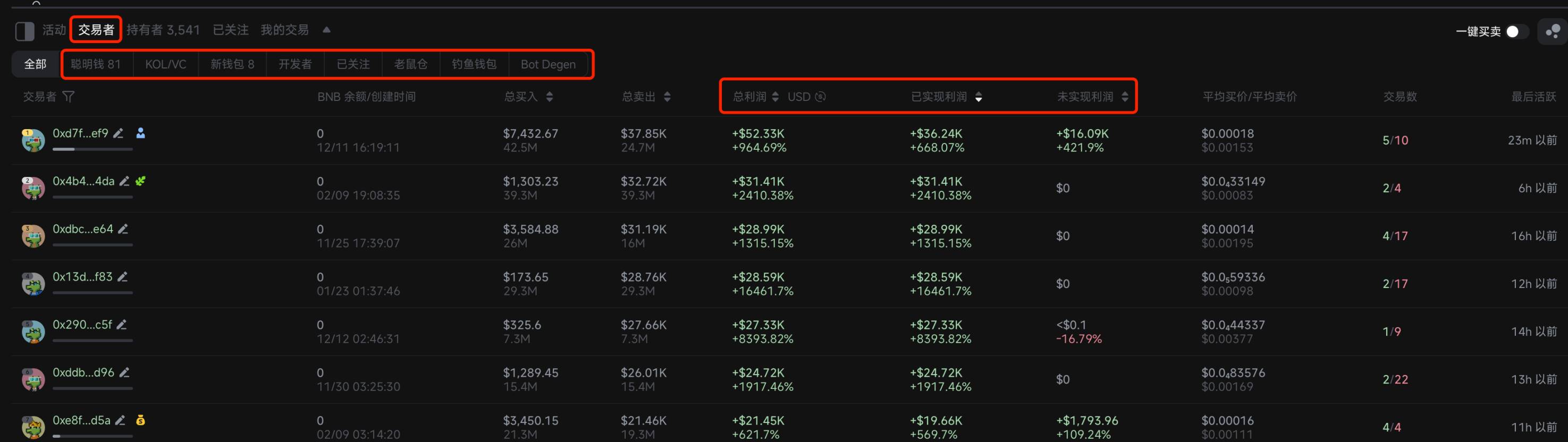 【交易者】是 Top100 最赚钱地址的列表,其中又按「聪明钱」、「KOL/VC」、「新钱包」、「开发者」、「老鼠仓」、「钓鱼钱包」、「Bot Degen」进行分类。我们可以按「总利润」、「已实现利润」、「未实现利润」等指标进行排序,筛选符合自己标准的聪明钱。