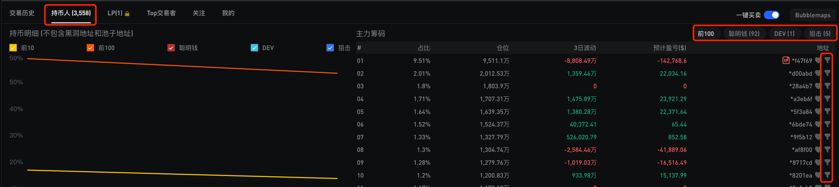 【持仓人】是 Top100 持仓地址的列表,又分为「聪明钱」、「DEV」、「狙击」。
