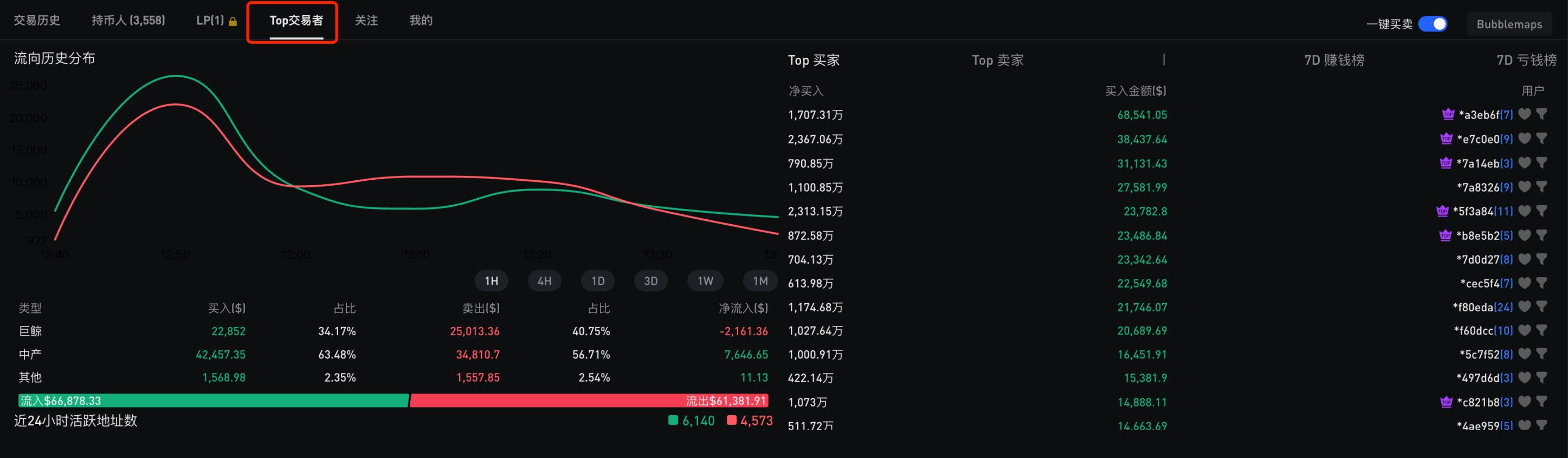 在gmgn 中输入分析币的 CA,重要看最下面的【交易者】和【持有者】版块。