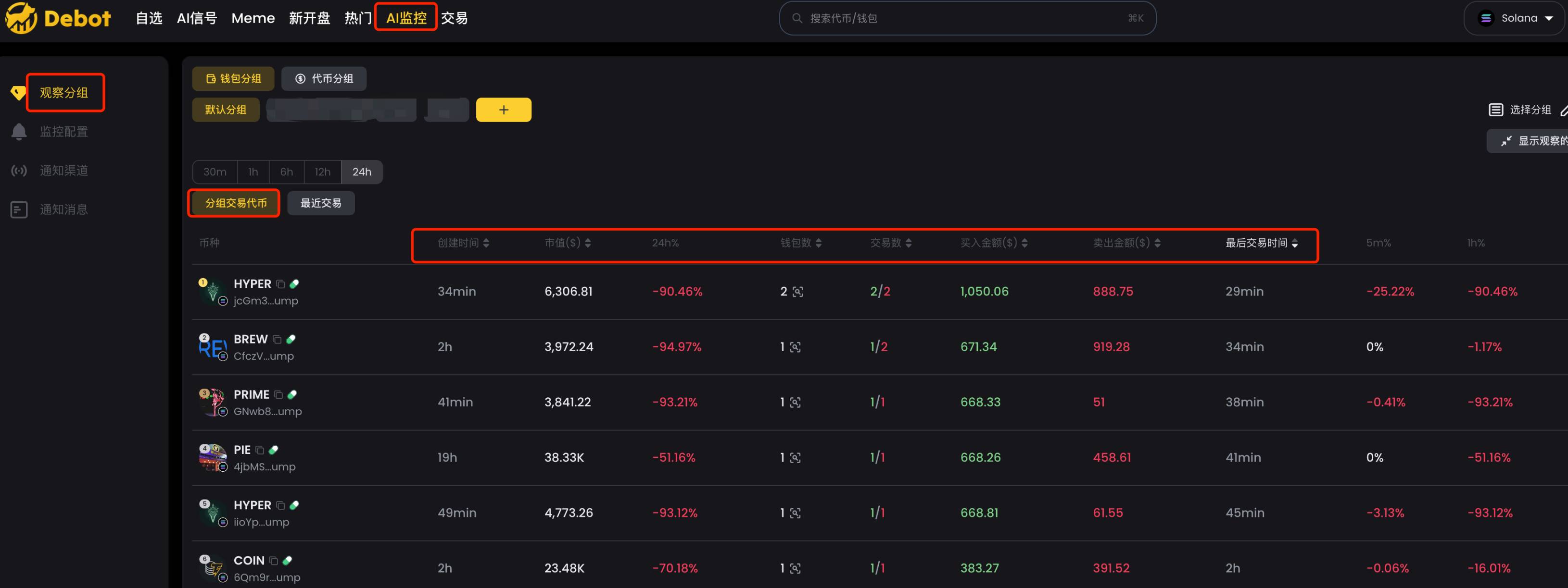 debot 监控导入聪明钱后,我们在【观察分组】中能按分组查看【分组交易代币】和【最近交易】。