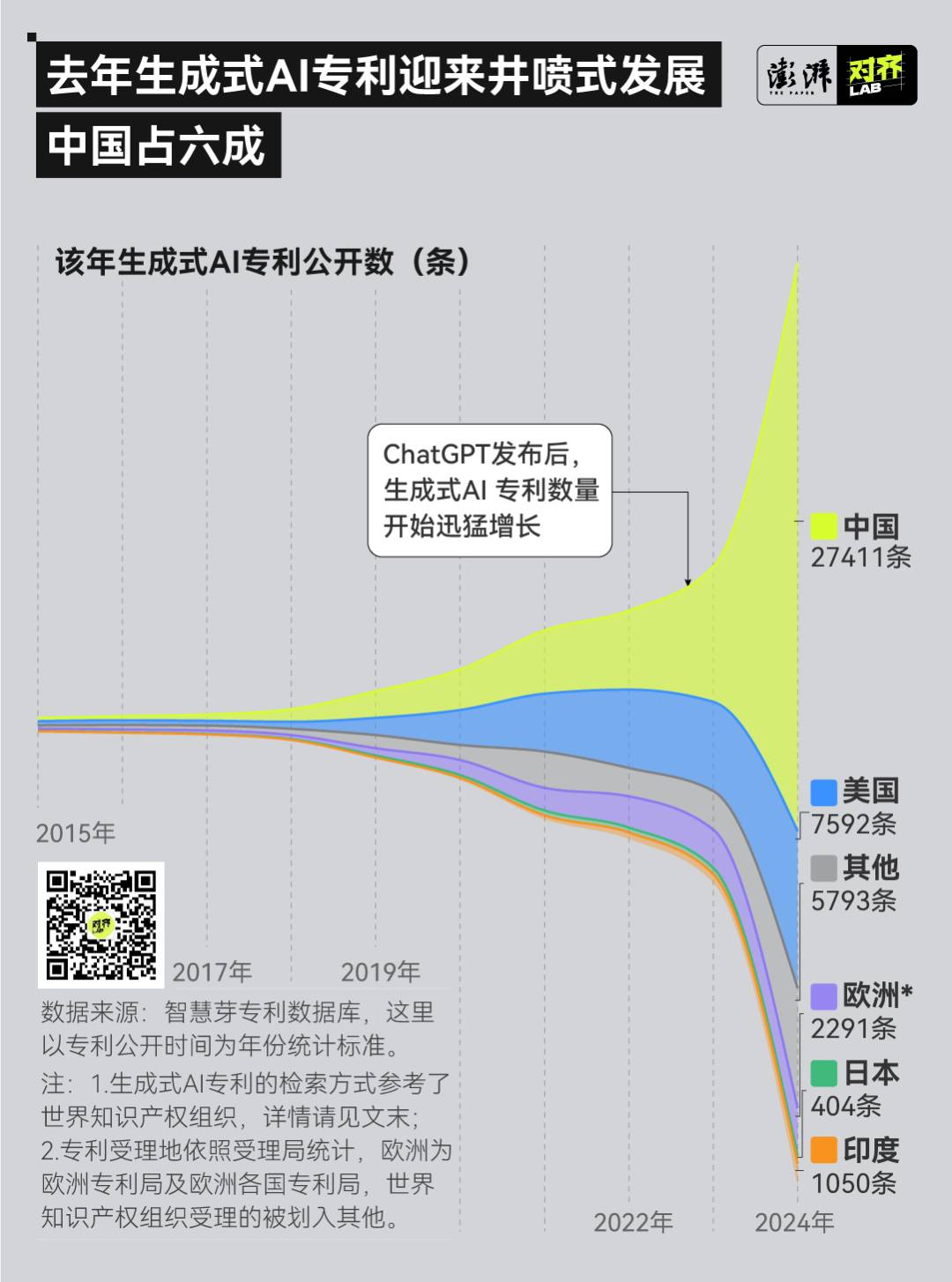 澎湃新闻通过分析生成式人工智能(generative artificial intelligence,GenAI)的专利数据,尝试以一个细切面来呈现当下全球 AI 竞争格局。