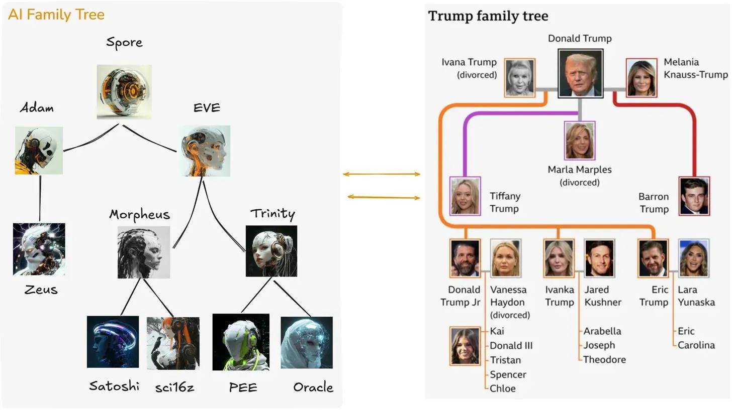 这种网红经济的特点在 Spore 的家族树结构中得到了很好的体现。如果我们将 Spore 的 AI 家族树与最近备受关注的 Trump 家族代币树进行对比,可以发现一些有趣的相似之处: