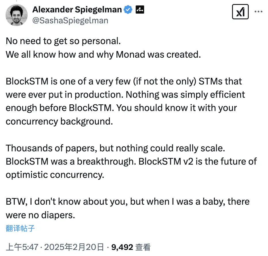 看到 Hunsaker 拒绝承认,Spiegelman 再次摆事实讲道理:「没必要对人不对事。我们都知道 Monad 是如何以及为何被创造的。BlockSTM 是极少数(如果不是唯一)投入生产的 STM 之一。在 BlockSTM 之前,没有什么能真正做到高效。以你的背景,你应该知道这一点。虽然有成千上万的论文,但没有什么能真正实现规模化。BlockSTM 是一个突破,BlockSTM v2 是未来。」说完,他不忘秀一下自己的资历:「顺便说一句,我不知道你怎么样,但我还是个婴儿的时候,还没有尿布呢。」