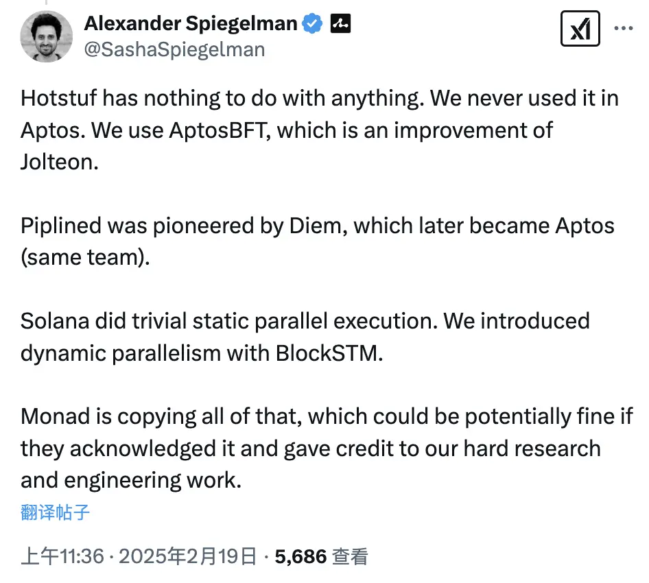 这次技术原创性之争,最先由 Aptos 研究主管 Alexander Spiegelman 开火:「不明白为什么 Monad 要花这么多时间来抄袭 Aptos 的技术。这一切都是开源的,且已经有了许多经同行评审的论文,与其遮遮掩掩,还不如大大方方地直接抄袭。」
