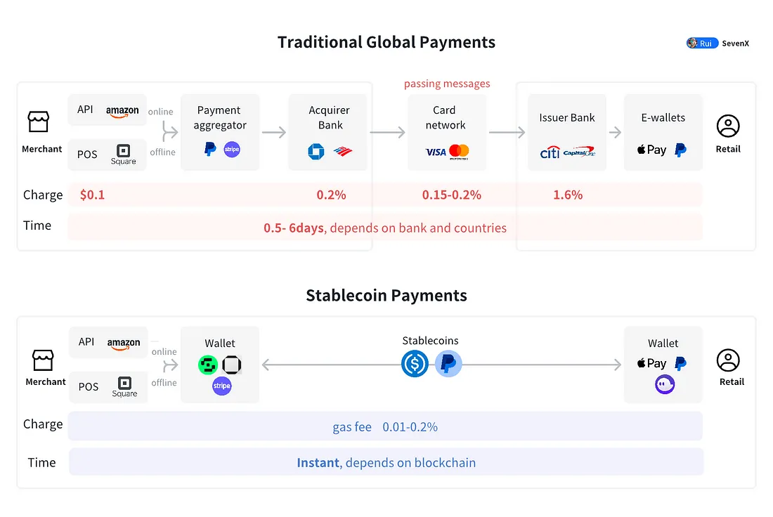 传统系统面临效率和成本限制。内部应用或银行转账提供即时结算,但仅限于其生态系统内。跨行支付的费用约为 2.6%(70% 支付给发行银行,20% 支付给收单银行,10% 支付给卡网络),结算需要超过一天。跨境交易则更加昂贵,约为 6.25%,结算时间可长达五天。