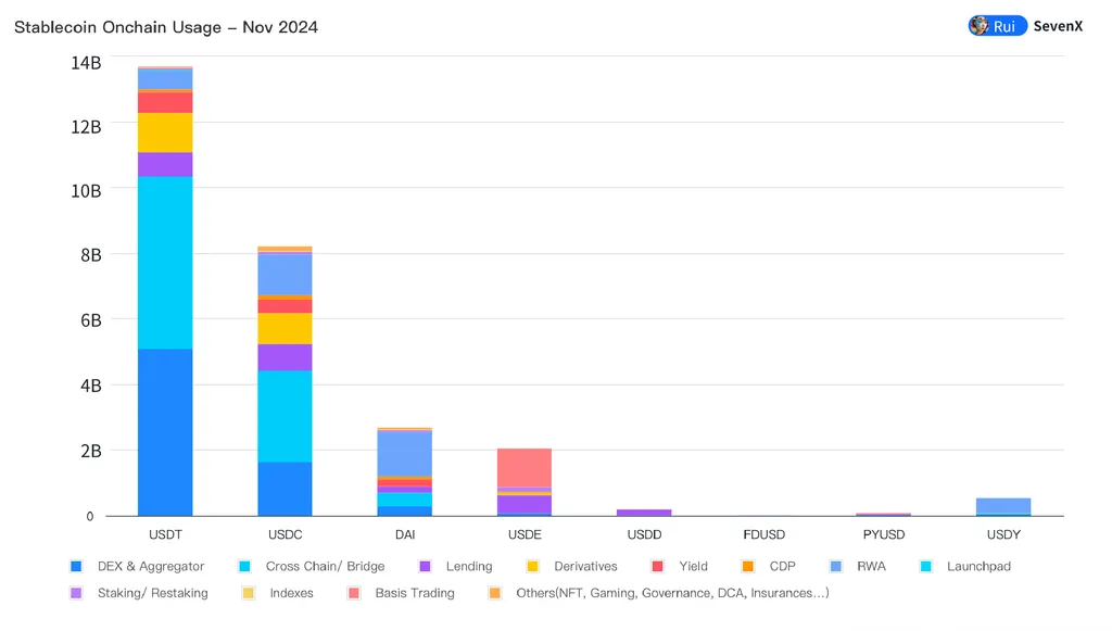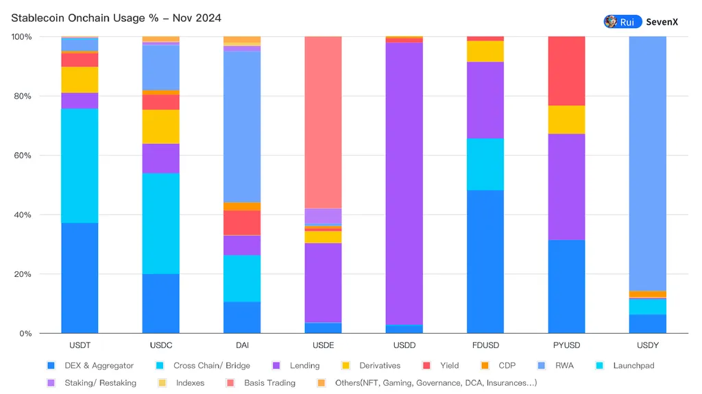 像 Jupiter、GMX 和 DYDX 这样的市场偏好 USDC 作为存款,因为 USDT 有更具怀疑色彩的铸币赎回流程。借贷平台如 Morpho 和 AAVE 偏好 USDC,因为它在以太坊上的流动性更好。另一方面,PYUSD 主要用于 Solana 的 Kamino 借贷,尤其是在 Solana 基金会提供激励时。Ethena 的 USDe 主要在 Pendle 中用于收益活动。