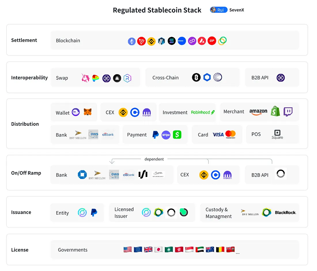 稳定币的发行需要技术实力、跨地区的监管合规以及强大的管理能力。关键玩家包括 Paxos(PYUSD,BUSD)、Brale(USC)和 Bridge(B2B API)。储备管理由像 BNY Mellon 这样的受信任机构负责,例如 USDC,安全地通过投资于其由 BlackRock 管理的基金来生成收益。BUIDL 现在允许更多的链上项目获取收益。