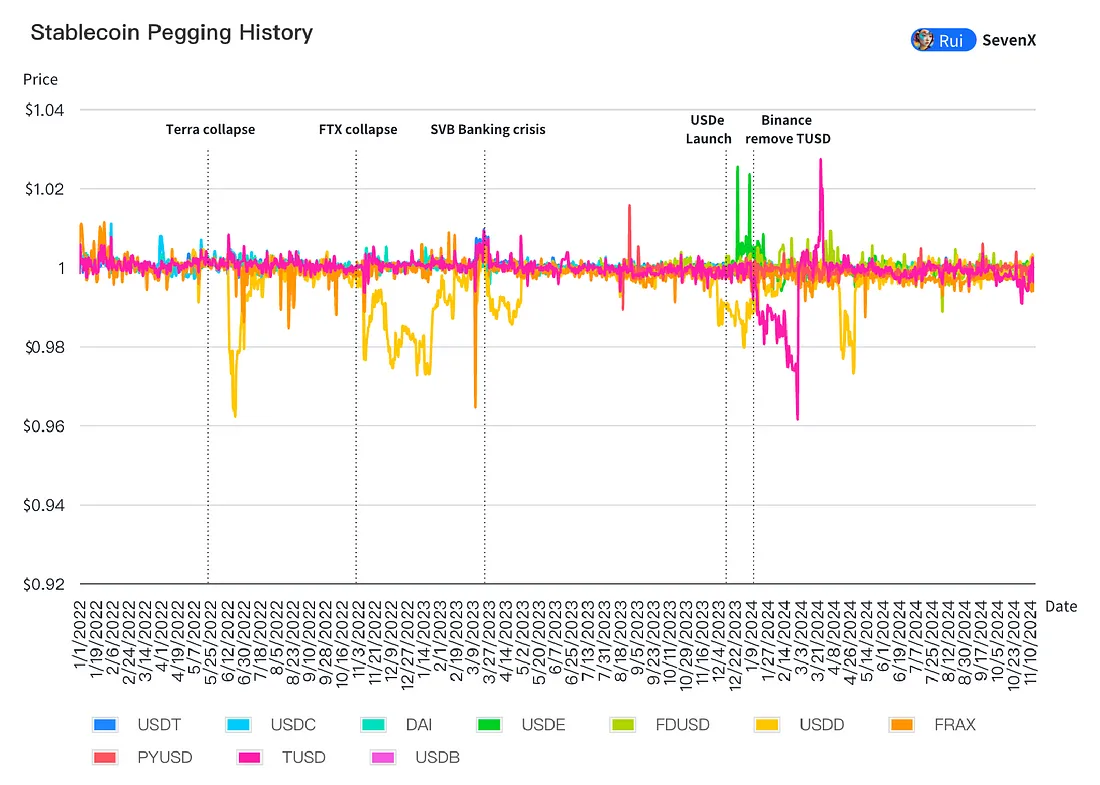 93.33% 的稳定币是法币支持的稳定币,它们具有更高的稳定性和资本效率,银行通过控制赎回来拥有最终决定权。像 Paxos 这样的受监管发行人,因其能够成功赎回数十亿美元的 BUSD,成为了 PayPal 的美元发行商。