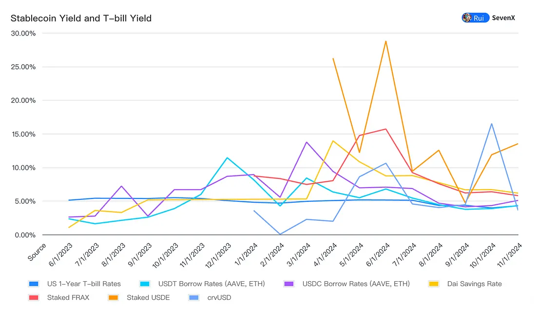 sFrax 和 DAI 在 T-bill 暴露方面处于领先地位,到 2024 年多个 RWA 项目提升了链上 T-bill 的可组合性:CrvUSD 将 Mountain 的 USDM 作为抵押品,Ondo 的 USDY 和 Ethena 的 USDtb 则由 BlackRock 的 BUIDL 支持。