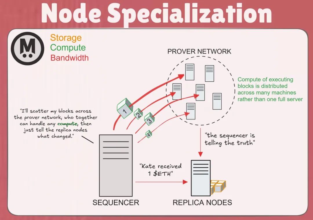 现在:完整节点被替换为一个副本节点,它只接收状态差异而不是完整区块,而完整区块则在整个证明节点网络中分发,这些节点独立执行这些区块,然后向副本节点报告区块有效的证明。