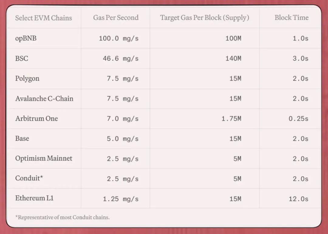 表:2024 年 EVM 链上 gas 参数比较(来源:Paradigm [https://www.paradigm.xyz/2024/04/reth-perf ])