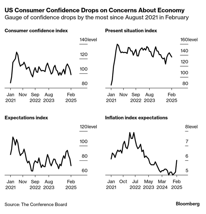 有越来越多的证据表明,由于特朗普总统政策的不确定性,美国人对经济未来的焦虑情绪加剧。美国消费者信心上个月急剧下滑,降幅为 2021 年 8 月以来最大。