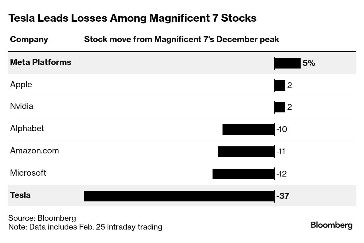 周二,彭博「七巨头」指数下跌了 3.4%,现已从 12 月 17 日创下的历史高点下跌超过 10%。在此期间,这七大公司的总市值已缩水 1.6 万亿美元。特斯拉是跌幅最大的公司之一,下降了 37%。