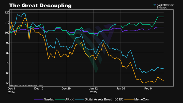 由于美国加密货币政策的变化未能达到预期,这加剧了市场情绪的转变,加密货币与传统股票市场之间的「脱钩」也在加剧。莱因韦伯表示:「加密货币与股票市场之间的相关性破裂非常不寻常,尤其是在当前宏观经济环境仍然偏向风险投资的情况下。」