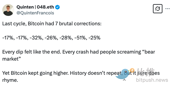 Quinten 在 X 平台发文表示:回顾历史,或许能为我们提供一些启示。在上一轮牛市周期中,比特币曾经历过七次幅度较大的回调,回调幅度分别为:-17%, -17%, -32%, -26%, -28%, -51%, -25%。每一次回调都曾引发市场恐慌,让人感觉「熊市」已至,每当价格大幅下跌,市场上总会充斥着「比特币已死」的论调。然而,历史证明,比特币最终都成功突破阻力,并继续向上攀升。诚然,历史不会简单重复,但往往会惊人地相似。