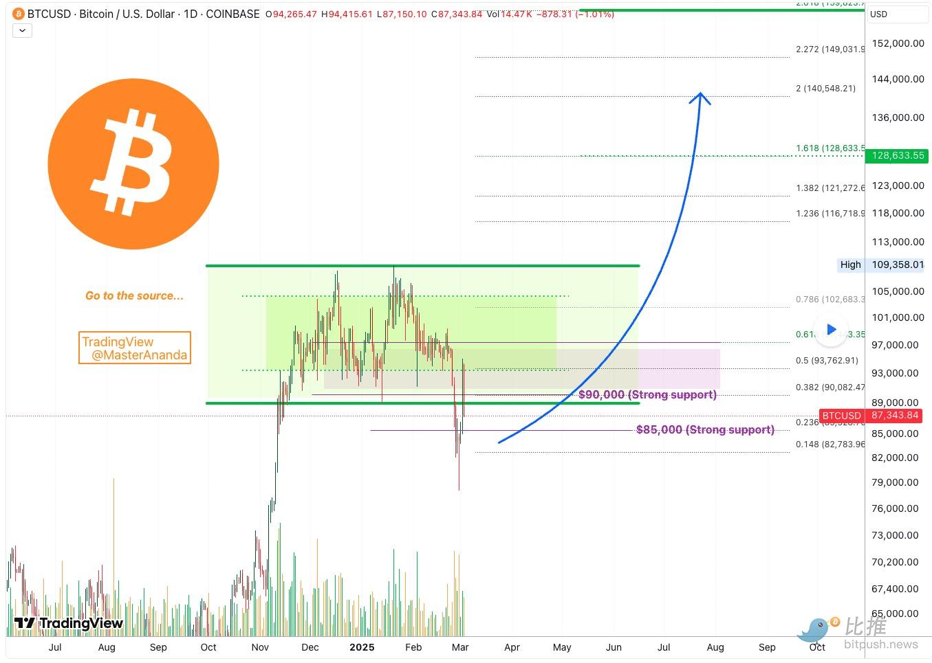 TradingView 分析师认为,BTC 短期内更为关键的支撑位依然是 85,000 美元,这一水平在近几周的市场博弈中扮演着至关重要的角色。