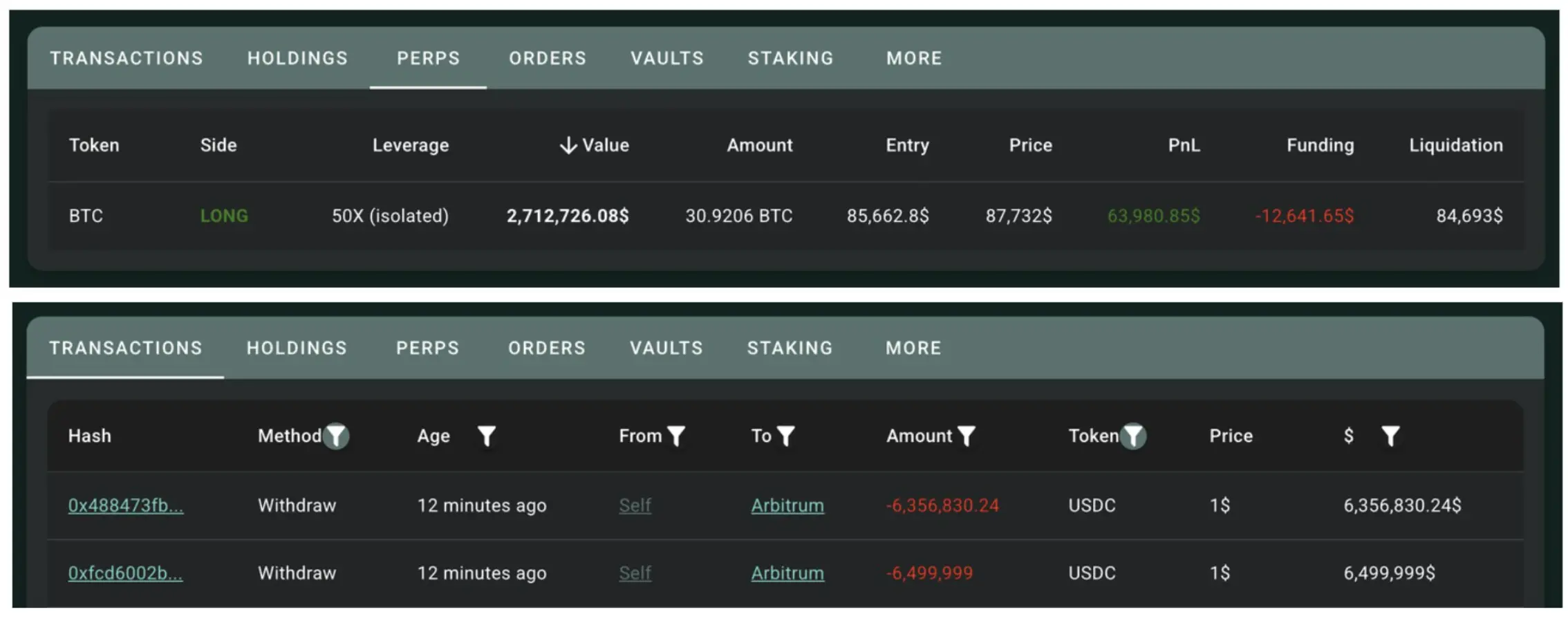 3 月 2 日,在 Hyperliquid 上 50 倍杠杆做多 BTC 和 ETH 的巨鲸,600 万 USDC 起始,24 小时内实现了 683 万美元的利润。