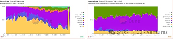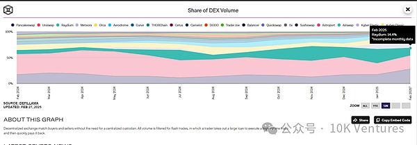 在Pump.fun的内盘结束后,meme币们会上到Raydium中来进行交易。25年1月,dex to cex trading volume的指数达到了近20%,突破了过去我们所说的15%天花板。根据我们年报所说,Meme币抢夺的其实是中尾部VC币的市场份额。尤其是在Trump夫妇在solana发行meme币后,Solana上的dex市占率进一步提升,在24年12月,raydium(solana) vs uni(ethereum)的市占率对比是19% vs 34%,但是在1月20号,Raydium的市占率已经和Uni持平,均在25%。在最近一周的trump trading中,Raydium的市占率甚至一度超过Uni。