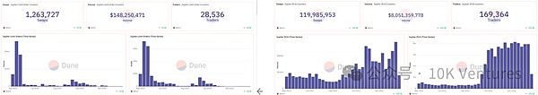 Jupiter是Solana上最大的perpdex和spot聚合器。Jupiter的核心业务主要就是:1.dex聚合;2.perp dex;3.DCA;4.限价单。Jupiter不在现货聚合交易中收取用户任何费用,但在Limit和DCA业务中收取0.1%的平台费,从下图交易量可以看出来,Perp dex trading volume才是主要收入贡献点。在永续合约中,Jupiter赚取用户开关仓AUM的0.06%作为收入来源,其次是爆仓费用。其次,Jupiter上线了JLP池,允许用户将流动性注入池中成为LP和散户进行对赌。Jupiter的交易费用和散户爆仓费用的一部分存入JLP池,因此JLP池的价值正在不断上升。JUP的token utility也在不断改善,目前JUP50%的协议费用用来回购JUP,给JUP带来了一定的价格保障。