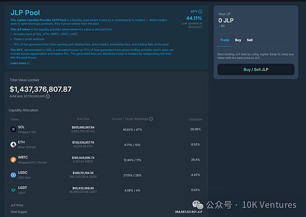 JLP可以看做是在合约里面和散户对赌,赚手续费和用户的盈利/亏损。按照大数定律,负和博弈下还能爆仓的合约交易所只要时间拉长一定是永赚。JLP就把原来CEX合约所的模式去中心化,允许散户在池子中添加流动性和其他玩合约的散户进行对赌,只要时间拉长一定赚钱,毕竟时间短的话碰到黑天鹅事件LP也是有亏钱可能性。JLP其实是一个很好的理财场景。除去资产池内的资产的涨幅(SOL ETH BTC一年的涨幅),池子的手续费+资金费率+用户净亏损带来的资产升值也达到了年化44.11%。