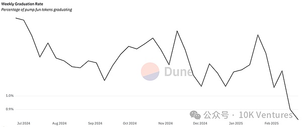 pump.fun 每日新增代币数从6万降至不足3万,部分因市场对“一键发币”模式审美疲劳,新币成功“毕业”(达到流动性门槛)的比例从1.5%降至0.8%,反映市场对低质量项目的淘汰加速,投机资金撤离后仅少数项目能存活。