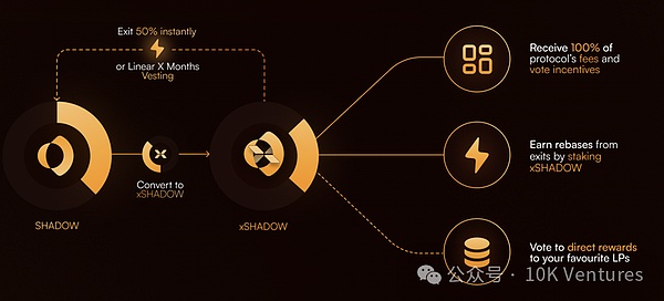 x(3,3)在ShadowExchange中体现的淋漓尽致,用户可以质押SHADOW从而获得xSHADOW。但是用户的赎回份额会随时间而变化,在15天内解锁则需要折价兑换,并在60天后才可以1:1完全兑换,期间的折价程度线性递减。