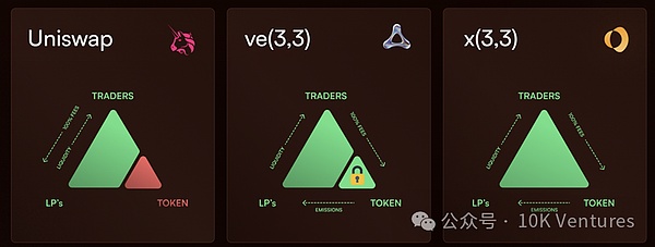 由于立刻退出需要折损50%,而折损的部分收益由剩余质押的人共享。这样的一种模式使得长期质押者可以获得:100%的协议费用、投票奖励和其余退出奖励。x(3,3)的模式不仅吸引了长期质押者的资沉,同时也解决了ve(3,3)的退出问题。