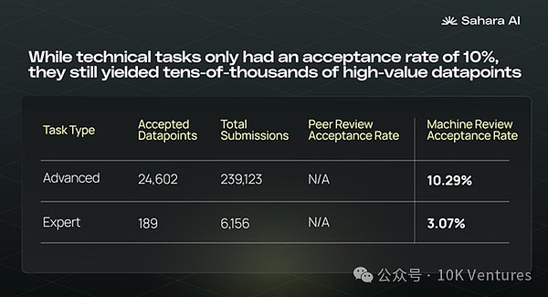 近期Sahara在业务上有一些有趣的数据可以分享。过去我们会charge去中心化的数据标注产生的数据质量是否能满足大模型的数据需求。从Sahara Test season1的数据我们看到虽然高级任务的接受率只有 10%,但它们仍然产生了 24000 多个对于测试 AI 模型安全性和稳健性至关重要的高价值数据点。这些任务的接受率较低表明策划高质量、特定领域的数据集很困难。这些任务要求贡献者生成旨在测试 LLM 边界的边缘对抗性输入。总的来说Sahara通过自动检查标记低质量的提交内容,去中心化的peer review,复杂二元人物的机器审查以及最后的Human QA review等措施提高数据质量。后续Sahara将会开展Test Season 2,继续扩大数据标注内容。