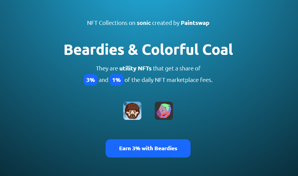该 NFT 系列可以获得 Paintswap 交易市场每日手续费收入的 3% 作为分红。此外有一个项目 Colorful Coal 是官方之前给 Beardies 的空投,也可以获得 Paintswap 交易市场每日手续费收入的 1% 作为分红。