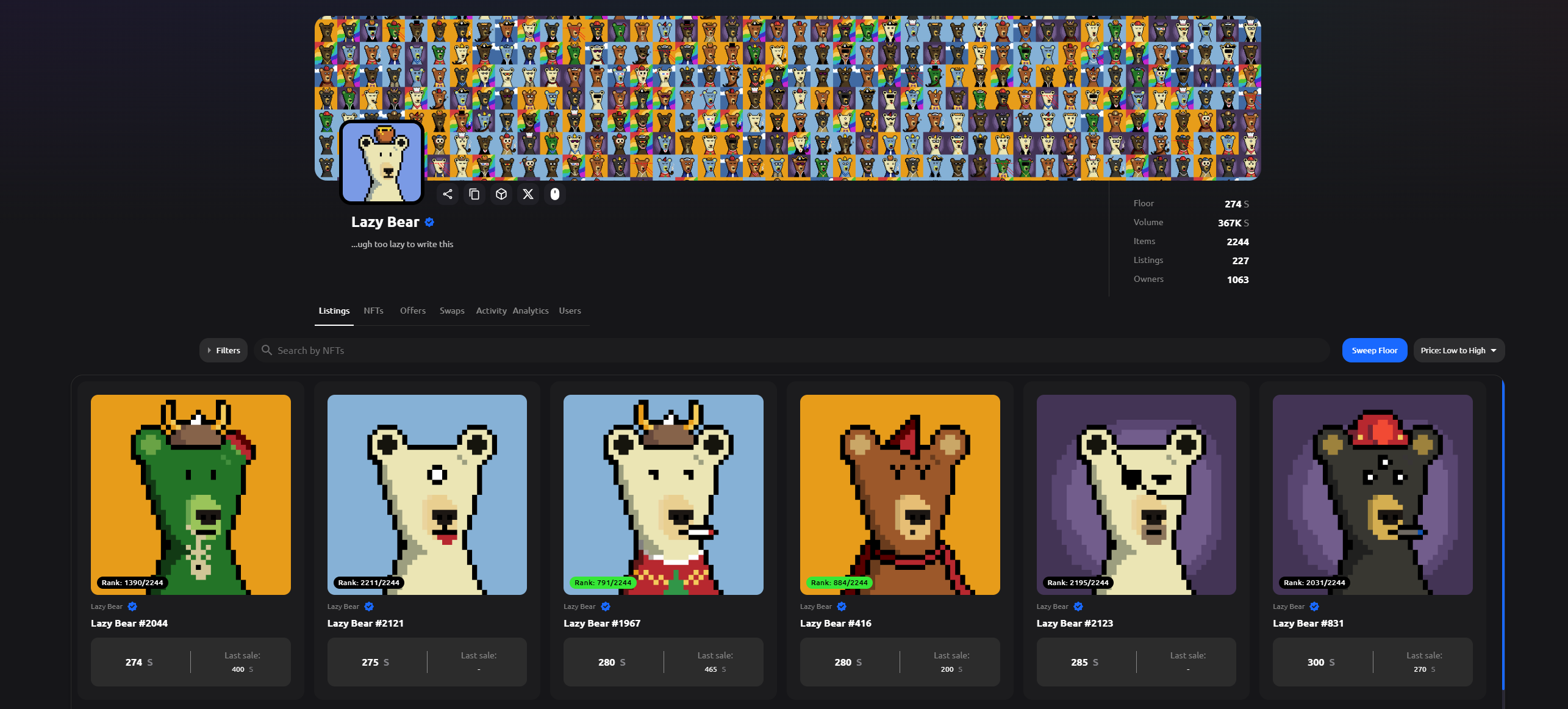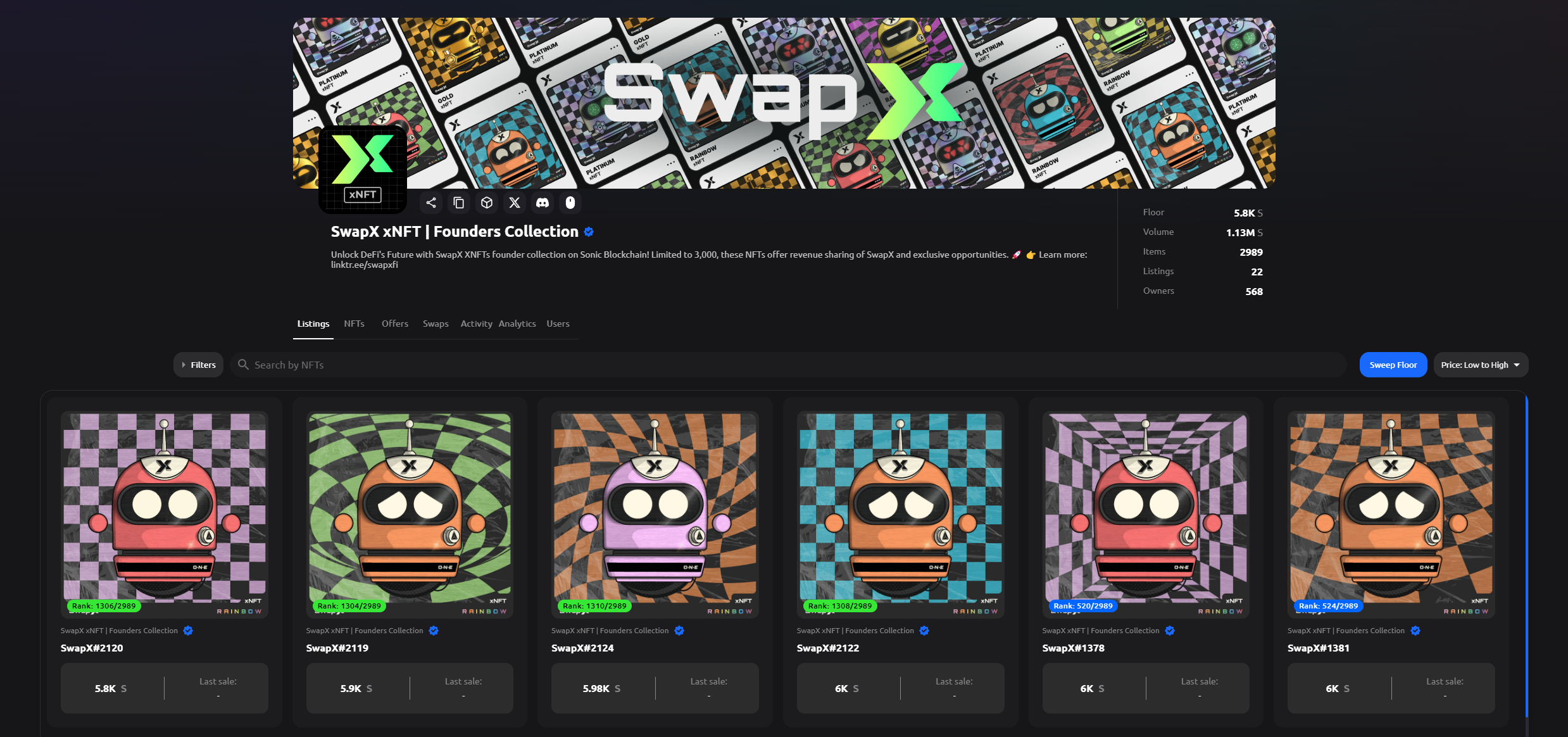 Sonic 上的 DEX 推出的 NFT 系列,总量 2989,目前地板价是 5800 $S,大约是 3300 美元。