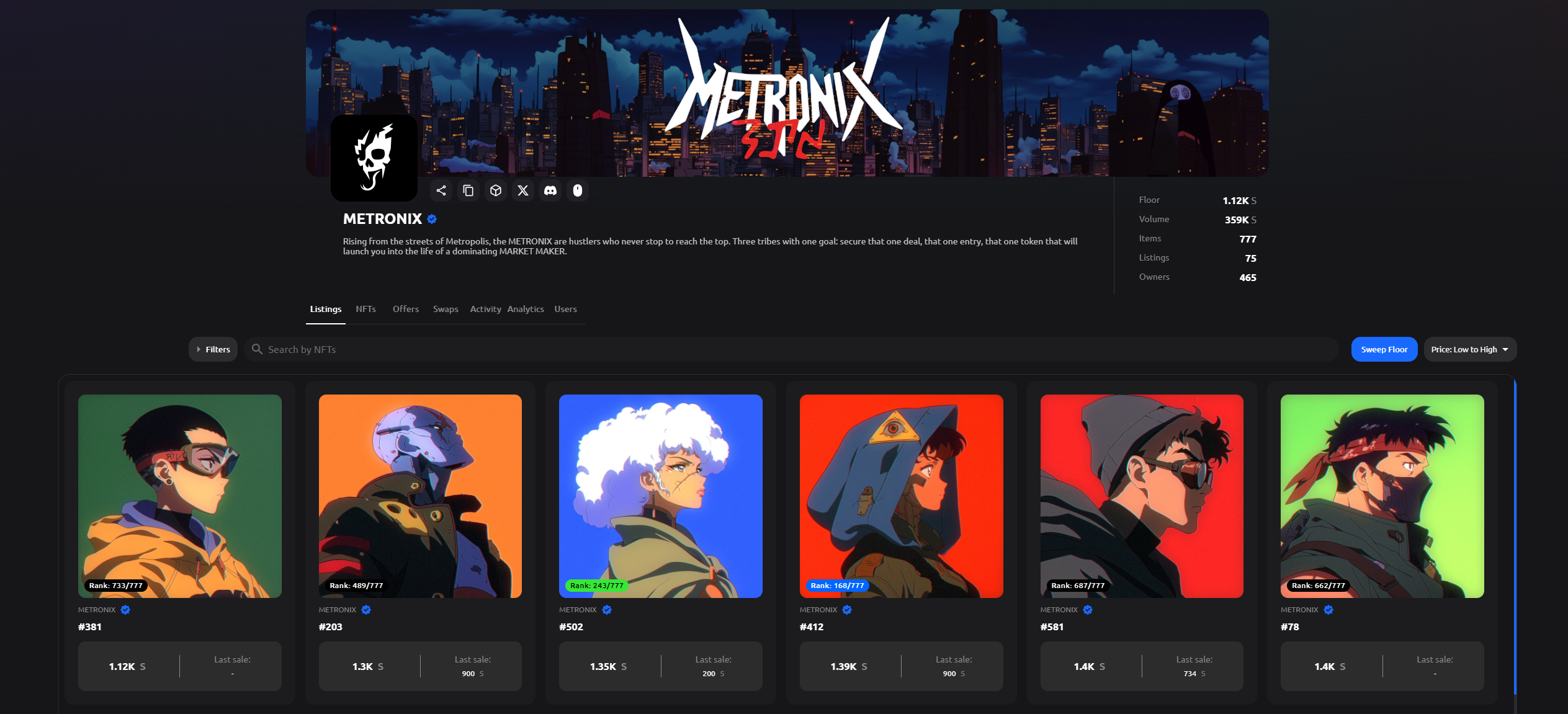 Sonic 上的 DEX Metropolis 发行的官方 NFT 系列,总量 777 个,目前地板价是 1120 $S,大约是 640 美元。