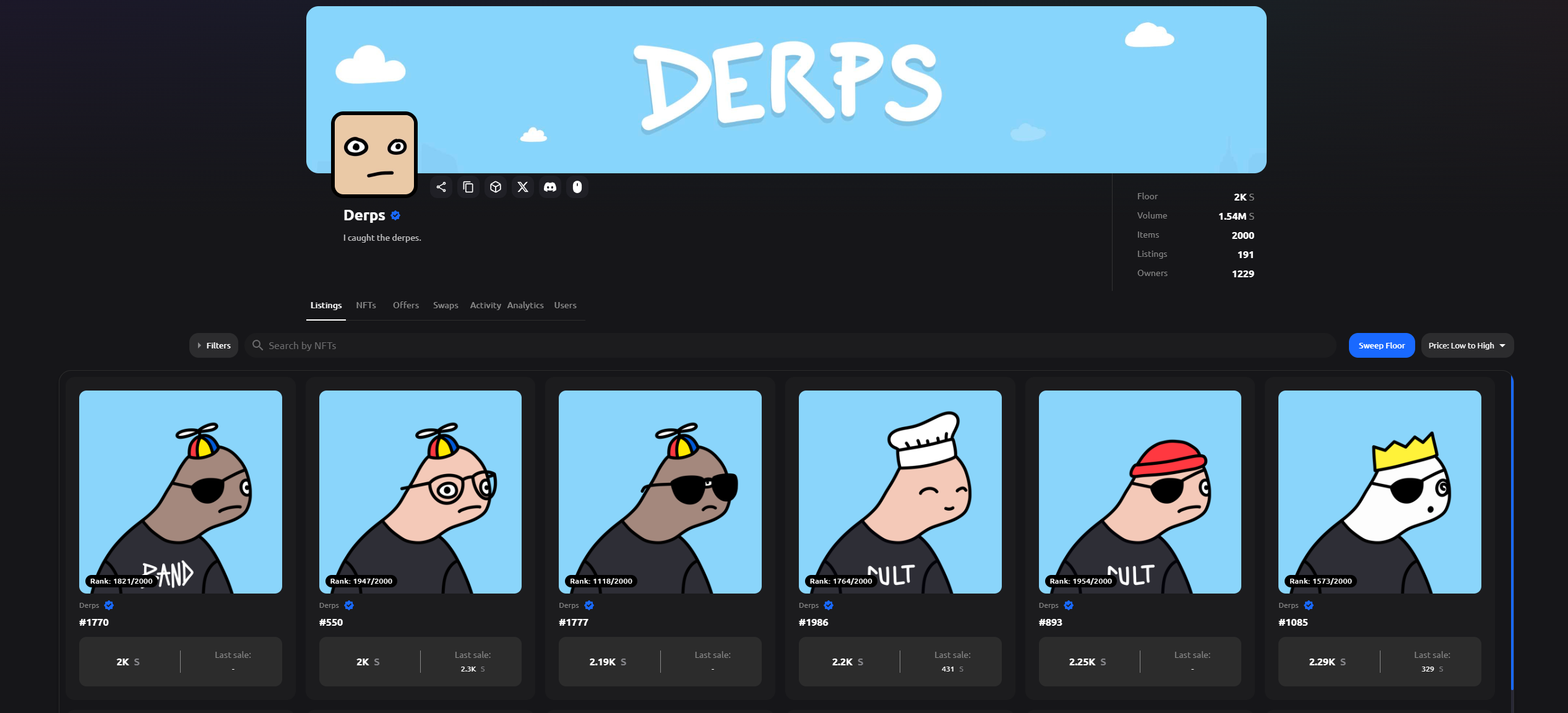 不过,在目前,Derps 最吸引人的当然还是「金铲子」效应。此前 Derps NFT 持有者获得了第一个大毛空投 $SHADOW,这是 Sonic 链上的一个 DEX,每个 Derps NFT 获得了当前价值约 2000U 的 $SHADOW。而 Derps 的 OG 系列 Derpe Dewdz(总量只有 100 个,当前地板价约为 Derps 的 5 倍)更是获得了当前价值约 8500U 的 $SHADOW。在一堆 Sonic 团队成员使用该项目作为 Twitter 头像的背景下,无疑让玩家们对 Derps 未来的「金铲子」效应有更高的预期。